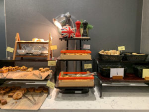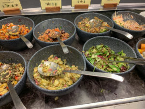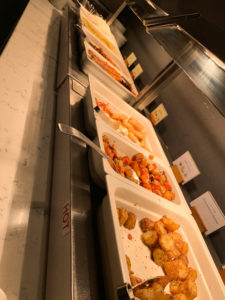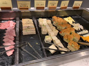 Στο κεφάλαιο φαγητό το αποτέλεσμα είναι -επίσης- πολύ καλό. Θα βρεις μικρά σάντουιτς και rolls, τυριά και αλλαντικά, φρούτα και φρουτοσαλάτα, καθώς και οκτώ επιλογές ζεστών φαγητών και των σχετικών συνοδευτικών τους (περιλαμβάνονται και επιλογές για vegetarian επιβάτες). Παράλληλα υπάρχουν γλυκά, τάρτες, κουλουράκια και μικρά κρουασάν.